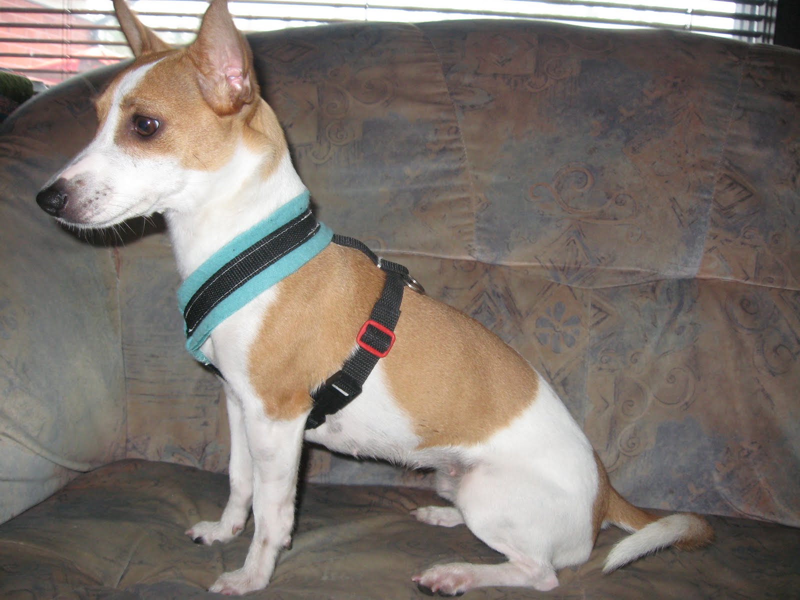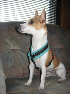Kaivoin esiin erilaisia kankaita, lukkonipsuttimia ja nylon-narua. Sitten viritin ompelukoneen kuntoon ja rupesin ompelemaan. Tunti tai kaksi siihen taisi mennä, mutta lopputulos oli erittäin tyydyttävä. Tässä kuvia valjaista mallinsa Nefin päällä.
